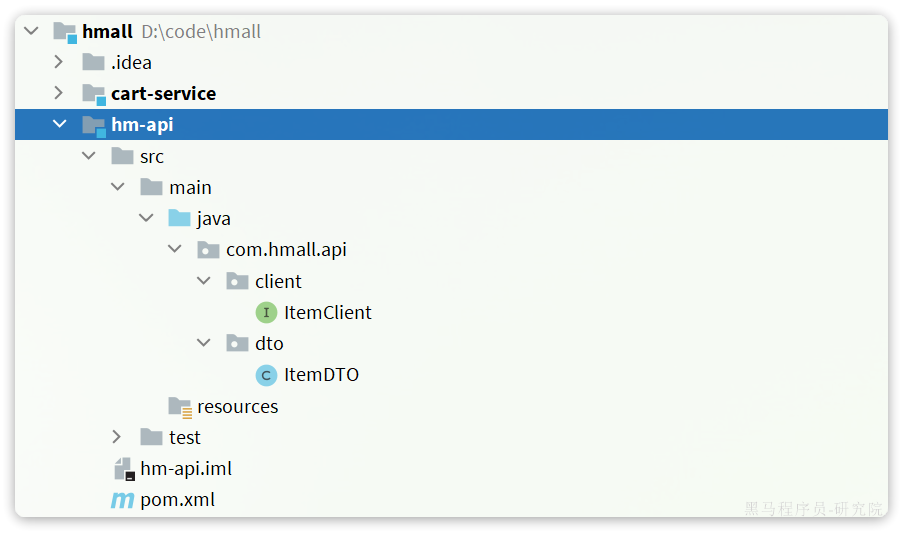 在hmall下定义一个新的module,命名为hm-api,然后把ItemDTO和ItemClient都拷贝过来,最终结构如下: